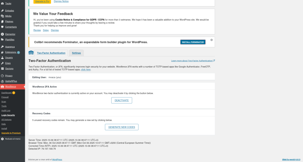 Primer de tot, el complement de seguretat Wordfence ofereix la possibilitat d’activar la verificació en dos passos per protegir l’accés com a administrador. Un cop activada aquesta funció, cal escanejar amb el mòbil un codi QR que proporciona el mateix plugin. Després, s’ha d’introduir un dels cinc codis de recuperació que apareixen en el segon pas per accedir a l’aplicació d’autenticació. Finalment, només queda escriure el codi temporal que genera l’aplicació al mòbil dins la casella corresponent per completar el procés de verificació.