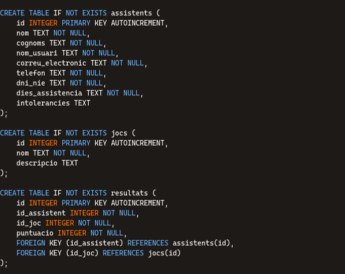La nostra base de dades està formada per tres taules principals: assistents, jocs i resultats. Cada taula té la seva pròpia clau primària i, en el cas de resultats, claus forànies que relacionen les dades entre si.
