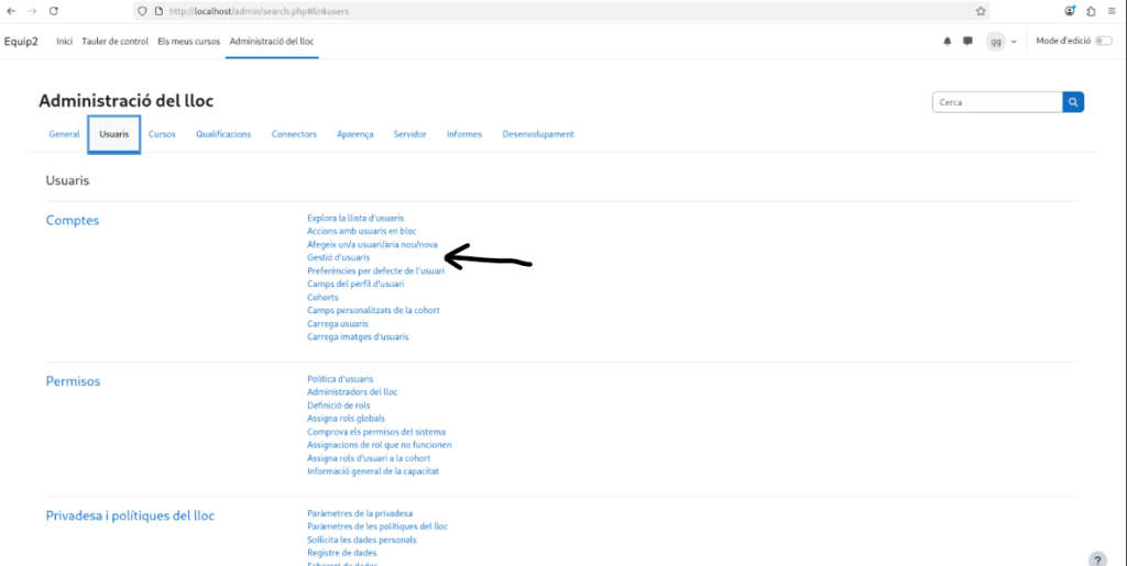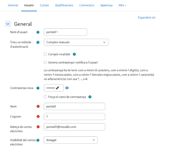 - Anem a Administració del lloc → Usuaris → Comptes → Afegeix usuari.