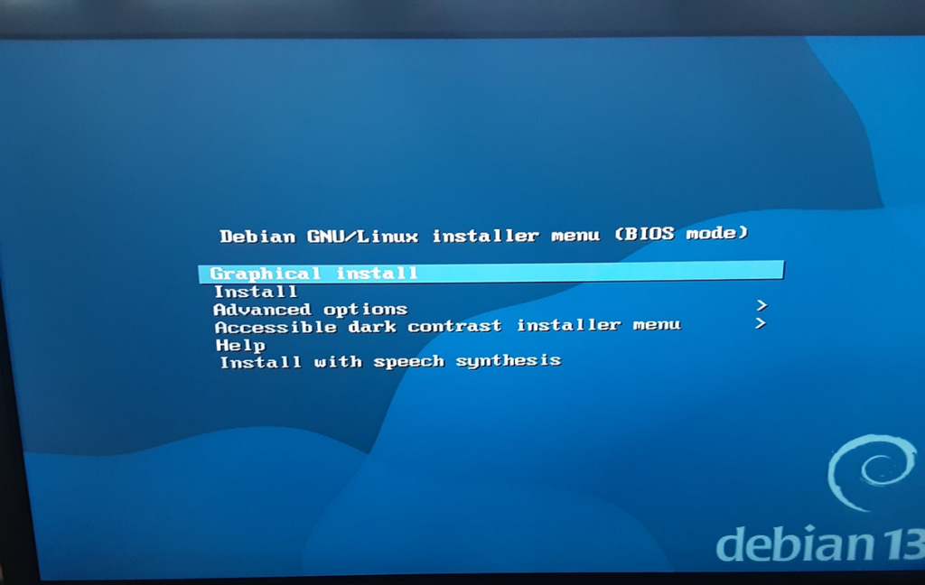 Quan aparegui el menú de Debian, seleccionem l’opció Install per començar el procés d’instal·lació.